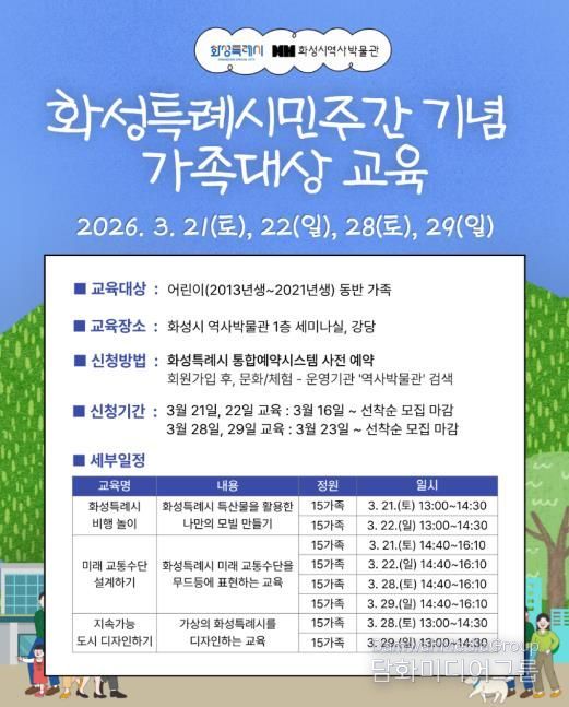 시민행정신문 강갑수 기자 | 화성시 역사박물관이 화성특례시민주간을 기념해 3월 21일과 22일, 28일, 29일 총 4일간 주말 교육 프로그램과 사회관계망서비스(SNS) 이벤트를 운영한다. 이번 행사는 시민들이 화성의 지리와 환경을 이해하고 미래 도시의 모습을 창의적으로 그려볼 수 있는 기회를 제공하고자 마련됐다.