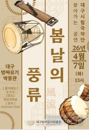 시민행정신문 강갑수 기자 | 대구문화예술진흥원 박물관운영본부 소속 대구방짜유기박물관은 봄날에 팔공산 역사문화 특강과 국악 공연을 기획해 3월 24일 오후 2시에 ‘탁본자료로 만나는 팔공산 역사문화 깊이’를, 4월 7일 오후 1시에 대구시립국악단 찾아가는 공연 ‘봄날의 풍류’를 개최한다.