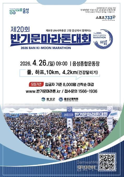 한편 반기문마라톤대회는 음성군의 수려한 자연 경관과 아름다운 코스로 전국 마라토너들에게 인기 있는 대회로, 오는 4월 26일 음성종합운동장에서 개최될 예정이다.