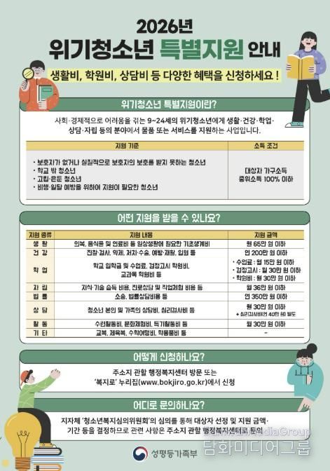 ‘위기청소년 특별지원사업’은 제도권 지원에서 소외되기 쉬운 청소년을 발굴해 실질적인 도움을 건네고, 빈곤·방임·고립 등으로 인한 위험을 예방해 안정적인 사회구성원으로 성장할 수 있도록 돕는 사업이다.