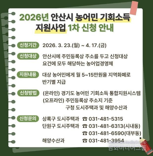 시민행정신문 강갑수 기자 | 안산시는 올해 안산시 농어민 기회소득 지원사업 1차 신청을 이달 23일부터 내달 17일까지 접수한다고 17일 밝혔다.