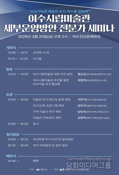시민행정신문 강갑수 기자 | 여수시는 오는 3월 20일 오후 2시 진남문예회관에서 ‘여수시립미술관 건립 세부운영방안 전문가 토론회(세미나)’를 개최한다고 밝혔다.