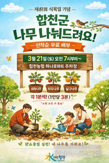 시민행정신문 강갑수 기자 | 합천군은 제81회 식목일을 기념해 나무와 숲의 중요성을 알리고자 합천군 산림조합과 공동으로 3월 21일 합천농협 하나로마트 주차장에서 2026년 나무 나눠주기 행사를 개최한다.