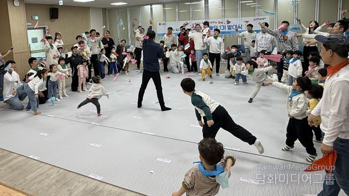 이어진 2부 행사에서는 아빠와 자녀가 함께하는 ‘스킨십 레크리에이션’ 프로그램이 진행됐다. 참가 가족들은 함께 몸을 움직이며 즐거운 시간을 보내고 서로 교류하며 ‘육아 동지’로서 첫 만남을 가졌다.