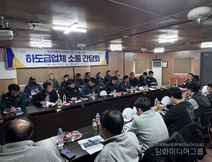 시민행정신문 강갑수 기자 | 포항시는 17일 포항 국제전시컨벤션센터(POEX) 건립 현장사무실에서 시공사 및 하도급업체 관계자들과 함께 '건립공사 소통 간담회'를 개최했다.