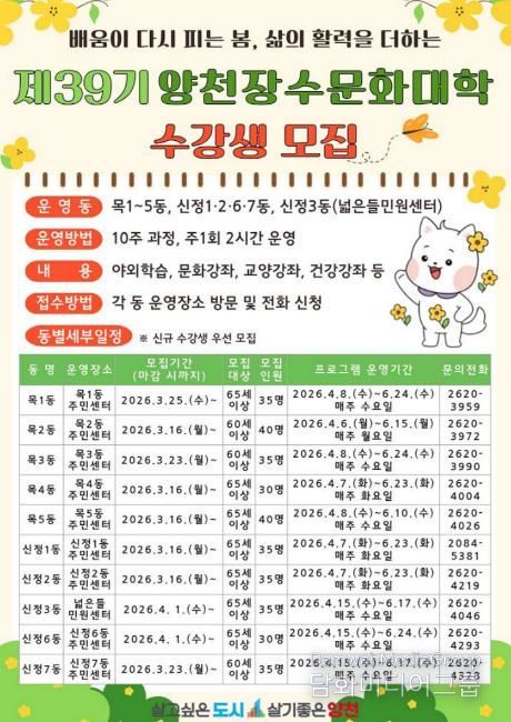 이번 제39기 장수문화대학은 4월 6일부터 6월 24일까지 목1~5동, 신정1·2·6·7동, 신정3동 넓은들민원센터 등 10개 동에서 동별 9주 과정으로 운영된다. 이후 전체 수강생이 함께하는 통합 수료식으로 마무리될 예정이다.