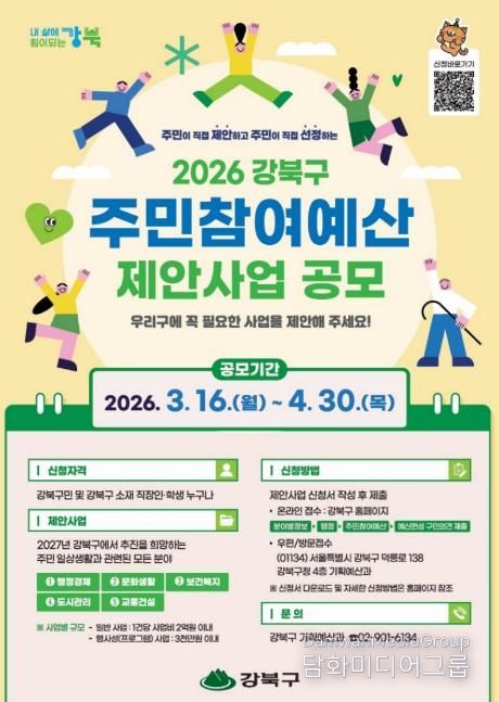 시민행정신문 강갑수 기자 | 서울 강북구가 구민의 다양한 의견을 구정에 반영하기 위해 오는 4월 30일까지 ‘2026년 강북구 주민참여예산 제안사업’을 공모한다.
