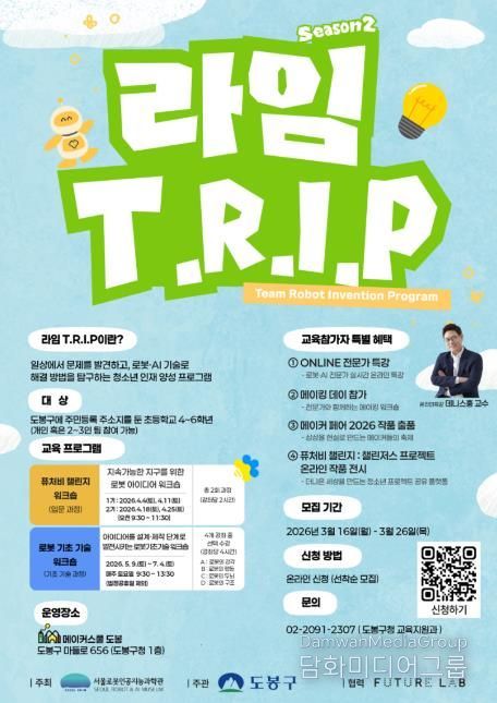 시민행정신문 강갑수 기자 | 서울 도봉구가 서울로봇인공지능과학관(RAIM)이 주최하는 '2026년 RAIM T.R.I.P(동행 로봇 발명프로그램)' 참여 자치구로 선정됐다고 밝혔다.