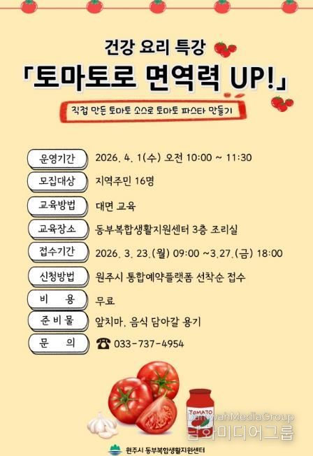 시민행정신문 강갑수 기자 | 원주시 동부복합생활지원센터는 오는 23일부터 ‘토마토로 면역력 업(UP)!’ 건강 요리 특강 프로그램 참여자를 모집한다.