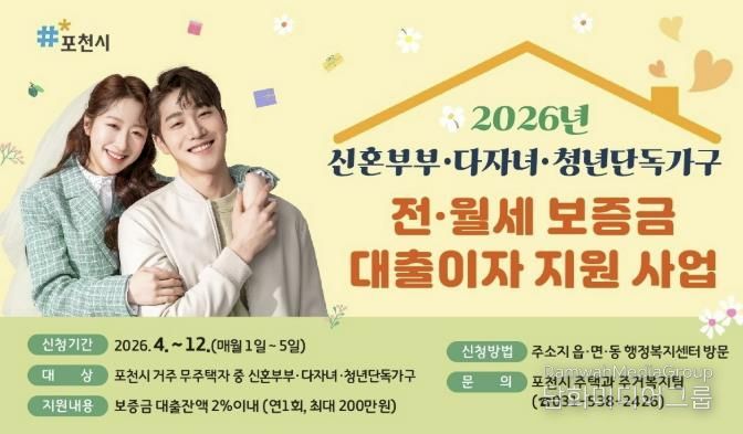 시민행정신문 강갑수 기자 | 포천시는 ‘2026년 신혼부부·다자녀·청년가구 전월세 보증금 대출이자 지원사업’을 추진한다.