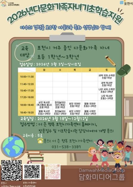 최선희 더 큰 행복 포천시가족센터장은 “다문화가족 자녀들이 우리 사회의 당당한 구성원으로 성장하기 위해서는 초등 저학년 시기의 기초학력 형성이 무엇보다 중요하다”며 “앞으로도 교육 사각지대를 최소화하고 다문화 아동이 자신의 꿈을 펼칠 수 있도록 지속적으로 지원하겠다”고 말했다.