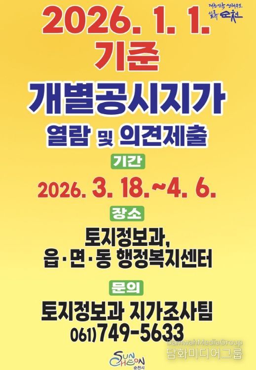 시민행정신문 강갑수 기자 | 순천시는 2026년 1월 1일 기준 개별공시지가의 열람 및 의견제출을 3월 18일부터 4월 6일까지 접수한다고 밝혔다.