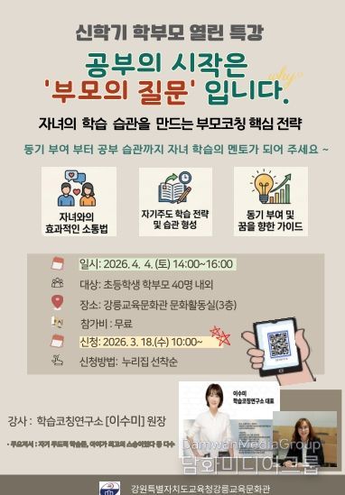 시민행정신문 기자 | 강릉교육문화관은 오는 4월 4일 오후 2시 초등학교 학부모를 대상으로 ‘학부모 열린 특강’을 운영한다.