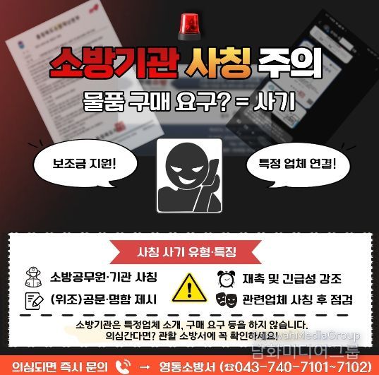 시민행정신문 강갑수 기자 | 영동소방서(서장 이도형)는 최근 소방기관을 사칭해 소방용품 구매를 유도하는 사례가 충북 도내에서 잇따라 발생함에 따라 군민과 관내 사업장 관계자들에게 각별한 주의를 당부한다고 전했다.