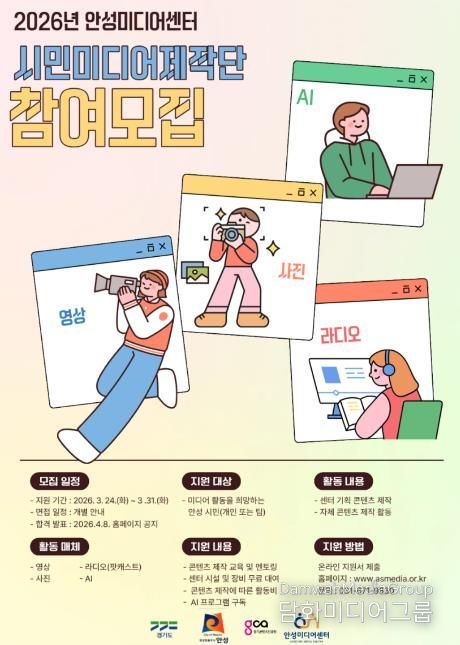 안성시 관계자는 “시민미디어제작단은 시민들이 자신의 이야기를 미디어 콘텐츠로 제작할 수 있도록 교육과 시설, 장비 등을 종합적으로 지원하는 사업”이라며 “올해는 특히 지역을 주제로 한 다양한 이야기를 콘텐츠로 제작해 지역사회와 소통하는 활동으로 자리매김할 수 있도록 운영할 계획”이라고 밝혔다.