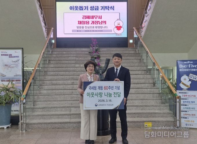 김종진 김해세무서장은 “국세청 개청 60주년을 맞아 성금을 기탁하게 됐다”며 “국민과 함께하는 따뜻한 세정을 실천하고 지역사회 공헌활동도 꾸준히 이어가겠다”고 말했다.