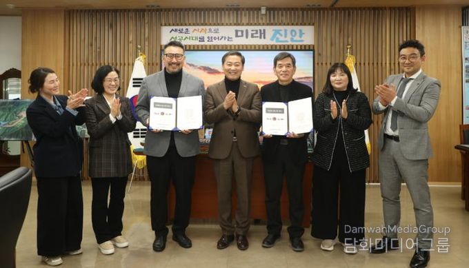 18일 진안군청 군수실에서 열린 계약식에는 강광배 ㈜케이샷/Ciao Asia 대표와 김정배 사업단장, 전춘성 군수, 한소영 과장이 함께했다.