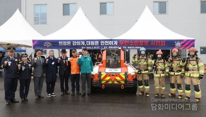 도 소방본부는 18일 청양에 위치한 충청소방학교에서 홍종완 도 행정부지사, 도와 시군 소방공무원 등 200여 명이 참석한 가운데 무인소방로봇 시연회를 개최했다.
