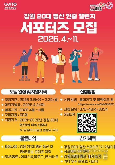 시민행정신문 강갑수 기자 | 강원특별자치도와 강원관광재단은 지난 3월 18일부터 오는 3월 30일까지‘강원 20대 명산 서포터즈 1기를 모집한다고 밝혔다.