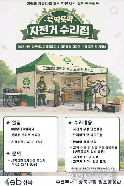 이승로 성북구청장은 “이번 ‘뚝딱뚝딱 자전거 수리점’은 주민들이 부담 없이 자전거를 점검하고 직접 수리 방법까지 배울 수 있는 기회”라며 “앞으로도 자원순환에 동참할 수 있는 다양한 프로그램을 운영해 생활폐기물 감량 실천을 확대해 나가겠다”고 말했다.