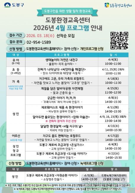 프로그램 신청은 3월 18일 오전 10시부터 도봉환경교육센터 누리집으로 하면 된다. 선착순으로 접수를 마감한다.
