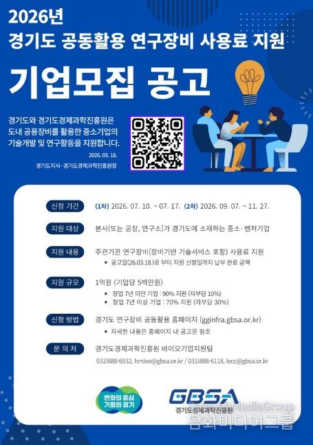 시민행정신문 강갑수 기자 | 경기도와 경기도경제과학진흥원이 도내 중소·벤처기업의 연구개발(R&D) 경쟁력 강화를 위해 ‘2026년 경기도 공동활용 연구장비 사용료 지원 사업’을 추진한다.