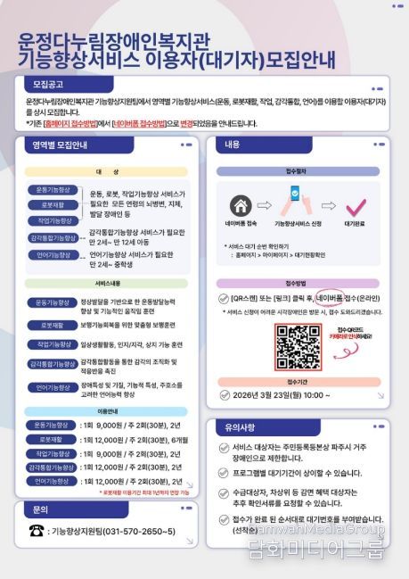 시민행정신문 강갑수 기자 | 파주시 운정다누림장애인복지관은 지역 내 장애인의 기능 향상과 일상생활 능력 증진을 위해 ‘기능향상서비스’참여자를 오는 23일부터 상시 모집한다.