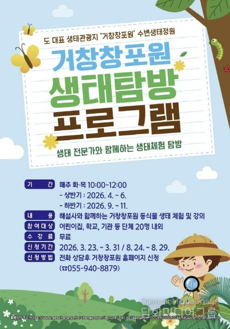 신동일 환경과장은 “거창창포원의 우수한 자연‧식물 자원을 활용한 체험 중심 교육을 통해 자연 이해도와 생태 감수성을 높이는 계기가 될 것으로 기대한다”며 “앞으로도 창포원의 교육‧체험 기능을 강화해 나가겠다”고 말했다.