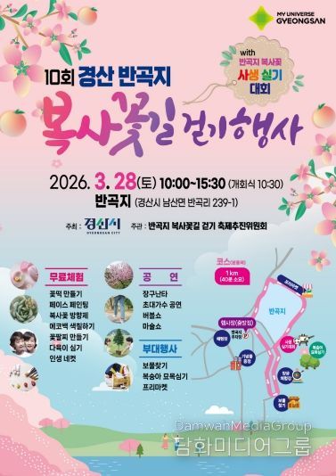 김만중 추진위원장은 “올해로 10회를 맞는 경산 반곡지 복사꽃길 걷기 행사가 지역을 대표하는 봄 축제로 더욱 발전하고 있다”며 “특히 올해 처음 열리는 반곡지 복사꽃 어린이·학생 사생대회를 통해 가족들이 함께 참여하고 즐길 수 있는 문화 행사로 만들어 가겠다”고 밝혔다.
