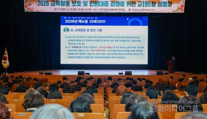 시민행정신문 강갑수 기자 | 전북특별자치도교육청은 19일 전주학생교육문화관 공연장에서 2026년 교육활동 보호 및 민원대응 강화를 위한 학교(원)장 설명회를 개최했다.