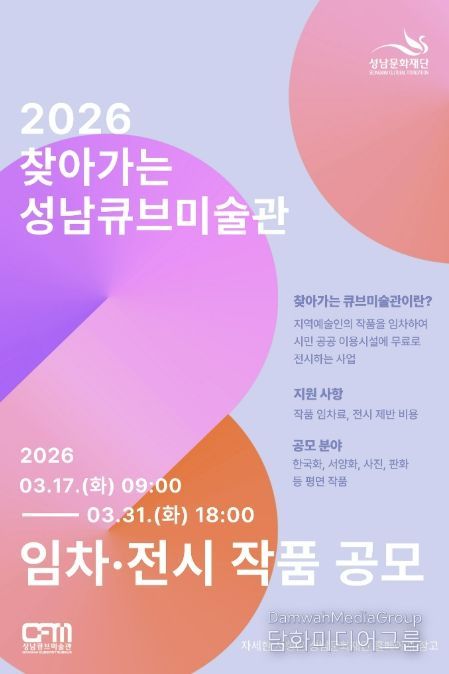 시민행정신문 강갑수 기자 | 성남문화재단은 지역예술인의 창작 환경 지원을 다각화하고 시민들의 문화예술 향유기회를 확대하고자 ‘2026 찾아가는 성남큐브미술관’ 작품 임차 공모를 진행한다.