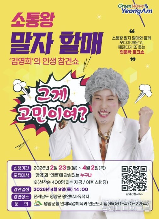 영암군은 오는 4월 9일 '말자할매 ‘김영희’의 인생참견쇼-그게 고민이여?'를 개최해 일상 속 고민을 유쾌하게 풀어보는 시간을 마련한다고 밝혔다. 이번 강연은 인문학을 보다 쉽고 친근하게 접할 수 있도록 기획된 프로그램으로, 봄철 지역 축제 기간과 맞물려 행사장을 찾은 관람객들도 함께 즐길 수 있도록 했다.