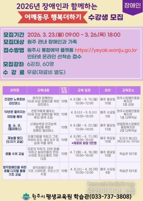 시민행정신문 강갑수 기자 | 원주시 평생교육원 학습관은 오는 23일부터 26일까지 장애인과 함께하는 ‘어깨동무 행복 더하기’ 1기 수강생을 모집한다.