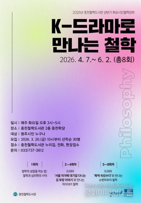 이번 강좌는 총 8회차로 구성되며, 도서관 2층 중천학당에서 진행된다. 원주시민 누구나 참여할 수 있으며, 드라마를 통해 철학을 쉽고 흥미롭게 접할 수 있도록 기획됐다.