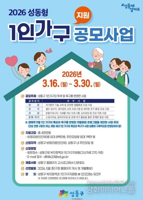 공모 신청 방법과 세부 내용은 성동구청 누리집(홈페이지)에서 확인 가능하며, 구청 복지정책과 1인가구지원팀로 문의하면 자세한 안내를 받을 수 있다.