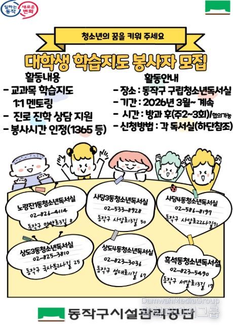 구는 3월 10일, 동작구시설관리공단과 중앙대학교 사범대학이 독서실 이용 청소년 대상 1:1 학습지도 서비스 운영을 위한 업무협약(MOU)를 체결했다고 전했다.