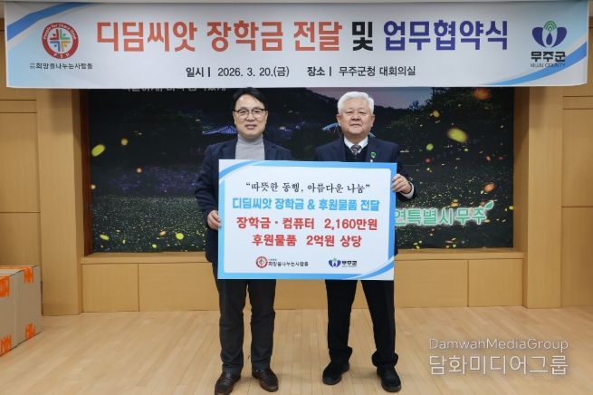 시민행정신문 강갑수 기자 | 무주군은 지난 20일 ‘(사)희망을나누는사람들’과 지역 내 취약계층 아동들의 꿈과 성장을 지원하기 위한 업무협약을 체결하고 ‘디딤씨앗 장학금’ 전달식을 가졌다고 밝혔다.