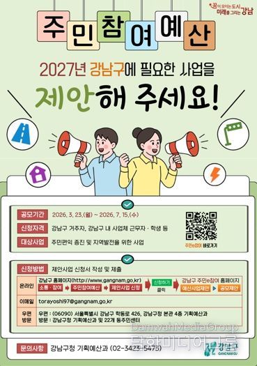 시민행정신문 강갑수 기자 | 꿈이 모이는 도시, 미래를 그리는 강남구가 2027년도 예산편성에 반영할 주민참여예산 제안사업 공모를 3월 23일부터 7월 15일까지 진행한다. 올해 공모 규모는 총 13억 원으로, 주민이 직접 생활 속 불편을 해결하고 지역에 필요한 사업을 제안해 예산에 반영하는 참여형 제도다.