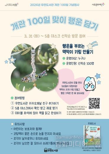 독서동아리 리더 특강은 서초구립우면도서관 누리집 안내를 통해 신청할 수 있고, 개관 100일 맞이 행운 담기는 31일부터 현장에서 선착순으로 참여 가능하다. 자세한 내용은 서초구립우면도서관 누리집, 공식 SNS에서 확인하거나 서초구청 교육지원과 도서관팀 또는 우면도서관으로 문의하면 된다.