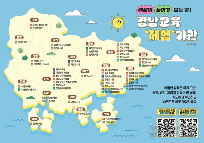 경남교육청은 도민들이 이러한 유용한 정보들을 놓치지 않도록, 시각자료로 통합하여 '배움이 놀이가 되는 곳, 경남교육 ‘체험’ 기관' 안내 지도를 제작했다. 과학·예술·수학 등 특화된 52개 기관 정보를 담은 이 지도는 큐알(QR)코드를 통해 예약 서비스까지 즉시 연결되며, 도내 전 학교 누리집과 가정통신문 등을 통해 제공된다. ※[붙임] 안내지도 참조