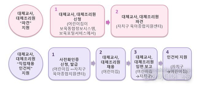 먼저 대체교사·대체조리원 파견 신청을 하고, 파견 지원이 어려운 경우엔 어린이집 직접채용 인건비 지원을 신청하면 된다.
