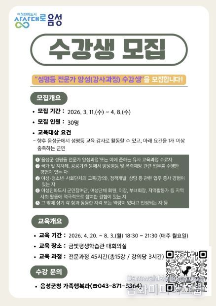 시민행정신문 강갑수 기자 | 음성군은 지역 맞춤형 전문 인력풀을 구축하고 지역 성평등 전문가 양성을 위해‘2026년 음성군 성평등 전문가 양성 강사 과정’ 수강생 30명을 모집한다고 23일 밝혔다.