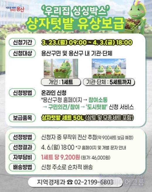 시민행정신문 강갑수 기자 | 서울 용산구가 아파트 베란다와 주택 마당 등 생활공간에서 손쉽게 작물을 키울 수 있는 ‘상자텃밭’ 보급에 나선다. 소소한 수확의 즐거움과 함께 도시농업을 일상으로 확산하겠다는 취지다.