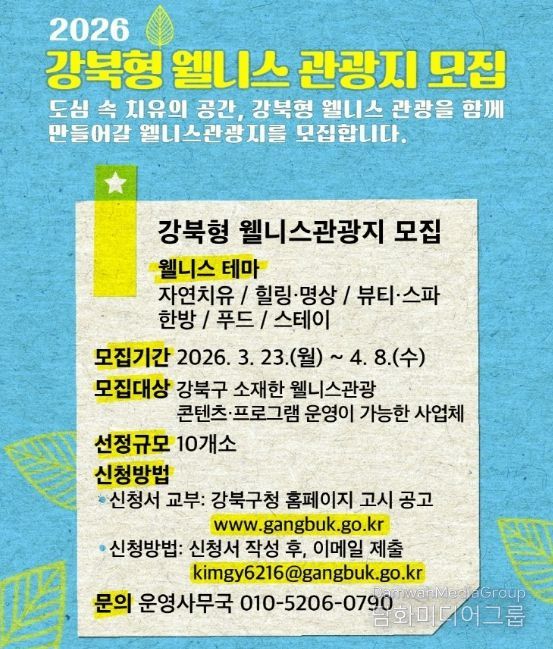 구는 ‘강북형 웰니스 관광 활성화 사업’의 일환으로 오는 3월 23일부터 4월 8일까지 ‘강북형 웰니스 관광지’ 10개소를 모집한다고 밝혔다.