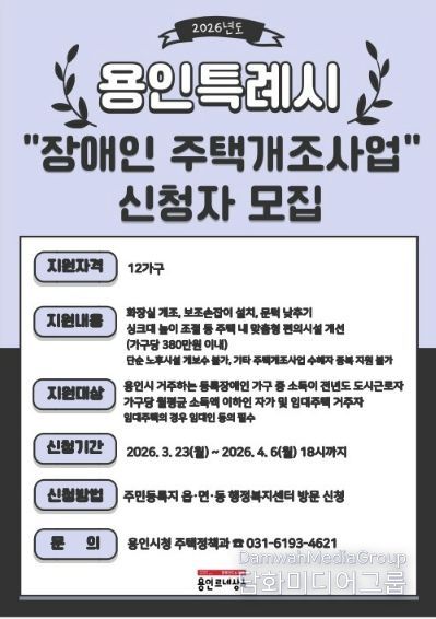 시민행정신문 강갑수 기자 | 용인특례시는 지역 내 등록장애인을 대상으로 생활환경 개선을 위한 주거용 편의시설 설치 지원사업 신청을 4월 6일까지 받는다.