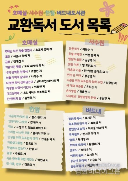 시민행정신문 강갑수 기자 | 수원시 권선구 4개 공공도서관(호매실·서수원·한림·버드내도서관)이 책을 매개로 서로의 생각과 감상을 나누는 ‘교환독서 클럽’ 참여팀을 모집한다.