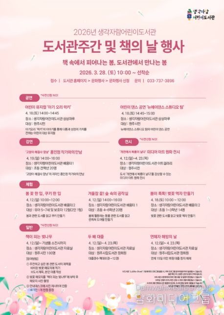 시민행정신문 기자 | 원주시 생각자람어린이도서관은 ‘도서관주간’과 ‘세계 책의 날’을 기념해 4월 12일부터 23일까지 강연, 공연, 체험, 전시 등 다양한 문화 행사를 운영한다.