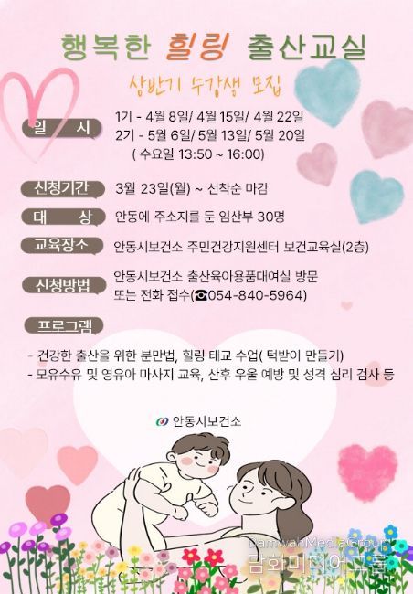 안동시 관계자는 “실습 중심 프로그램과 체계적인 정보 제공을 통해 임산부의 출산 불안을 줄이고 건강한 출산을 지원할 것”이라며 “앞으로도 아이 낳고 키우기 좋은 환경 조성을 위해 모자보건 서비스를 지속 확대해 나가겠다”고 밝혔다.
