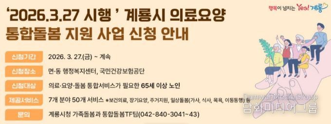 시민행정신문 기자 | 충남 계룡시는 오는 27일부터 시작되는 ‘의료·요양 통합돌봄 지원사업’ 상담과 신청을 위해 면·동 행정복지센터 및 국민건강보험공단에 통합지원창구를 운영한다고 밝혔다.