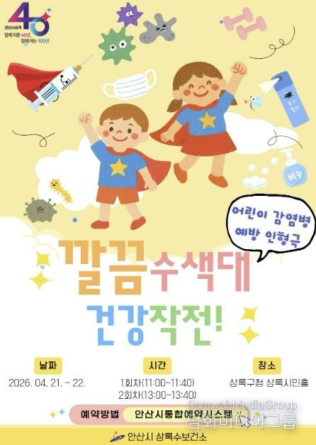 시민행정신문 기자 | 안산시는 내달 21일부터 22일까지 이틀간 상록구청 상록시민홀에서 어린이 감염병 예방 인형극 ‘깔끔수색대 건강작전’을 상연한다고 23일 밝혔다.